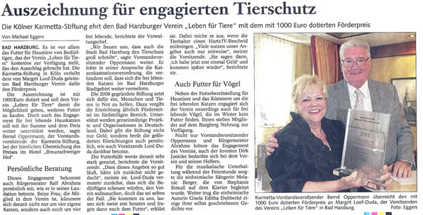 Erstmalig wurde am 17.06.2011 in Bad Harzburg der Karmetta-Förderpreis verliehen. Die Auszeichnung ging an den Verein "Leben für Tiere e.V.". Im feierlichen Rahmen überreichte Bernd Oppermann, Vorstandsvorsitzender der Karmetta-Stiftung, den mit 1.000 Euro dotierten Förderpreis. Margrit Loof-Duda, Vorsitzende des Vereins "Leben für Tiere", nahm die Auszeichnung entgegen. Der in Bad Harzburg ansässige Verein wurde für seine engagierte Tierschutzarbeit ausgezeichnet. "Leben für Tiere" setzt sich seit Jahren für artgerechte Tierhaltung ein, stellt bedürftigen Tierhaltern kostenlos Futter zur Verfügung und betreut frei lebende Katzen.