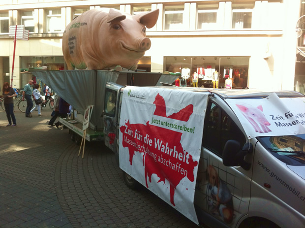 Seit Jahren wendet sich die Albert-Schweitzer-Stiftung gegen quälerische Methoden der Intensivtierhaltung. Mit Ihrer bundesweiten GrunzMobil-Kampagne macht die Stiftung auch dieses Jahr wieder gegen Massentierhaltung mobil. Am 23. und 24. März war das GrunzMobil nun erstmalig in Köln. Das Fahrzeug mit dem rosa Riesenschwein stieß bei Passanten in der Kölner Innenstadt auf reges Interesse. Viele Kölner nutzten die Gelegenheit, um mehr über das Leiden der Tiere in der Massentierhaltung und Möglichkeiten einer fleischlosen Ernährung zu erfahren. Die Karmetta-Stiftung war Sponsor der zweitägigen Infoveranstaltung und hat die Aktion organisatorisch und personell unterstützt.