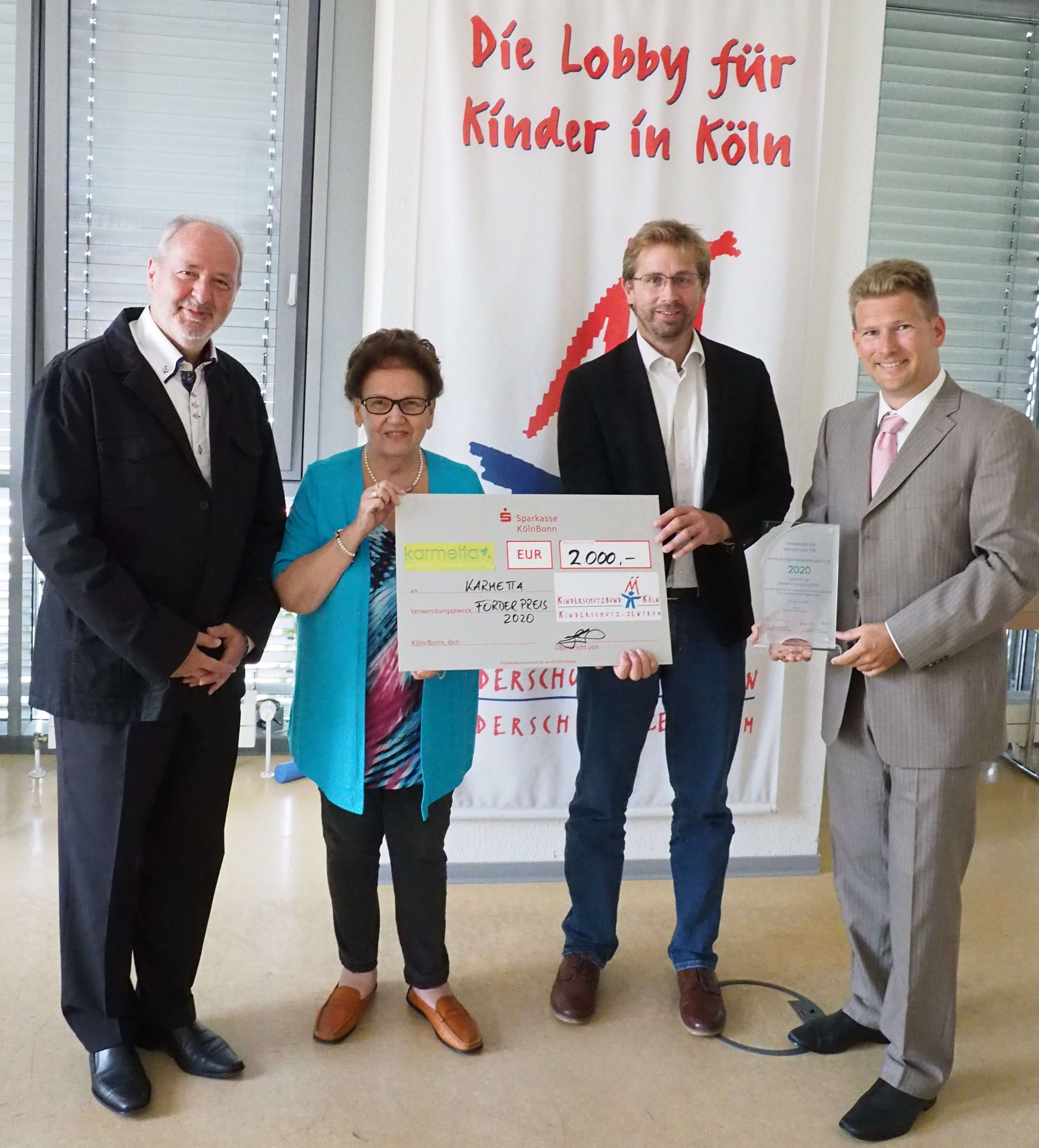 v.l.n.r.: P. Epper (Mitglied des Kuratoriums der Karmetta-Stiftung), H. Oppermann (stellv. Vorsitzende des Kuratoriums der Karmetta-Stiftung), L. Hüttler (Geschäftsführer des Kinderschutzbundes Köln), Dr. S. Haas (stellv. Vorstandsvorsitzender der Karmetta-Stiftung)