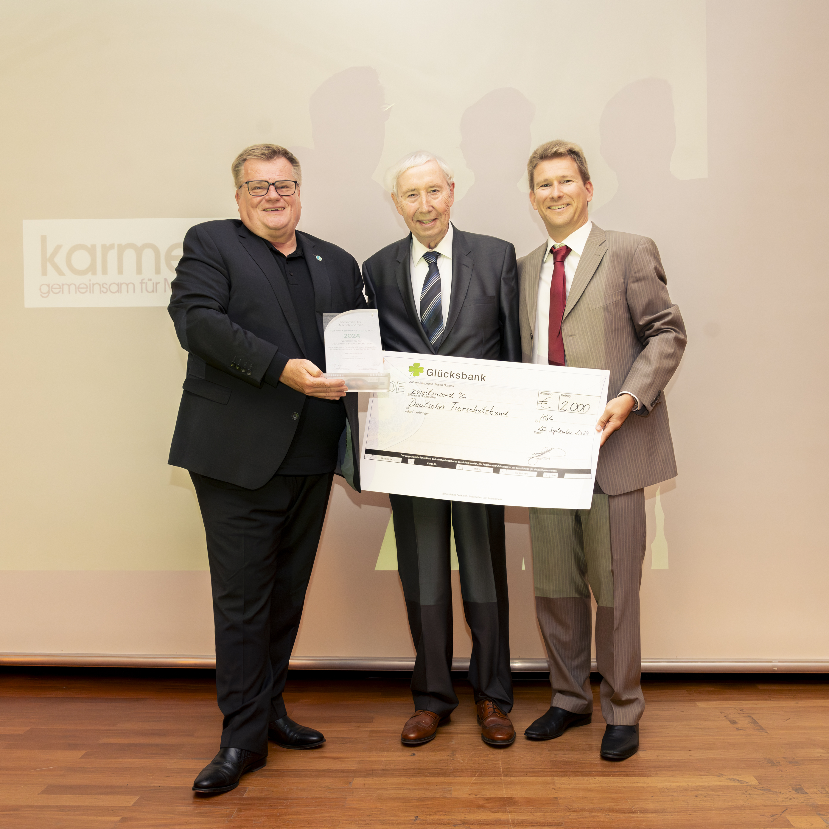 Karmetta-Förderpreisverleihung am 20.09.2024: v.l.n.r. Th. Schröder (Präsident Deutscher Tierschutzbund e. V.), H. Nopper (Vorsitzender des Kuratoriums der Karmetta-Stiftung), Dr. S. Haas (stellvertretender Vorsitzender der Karmetta-Stiftung)