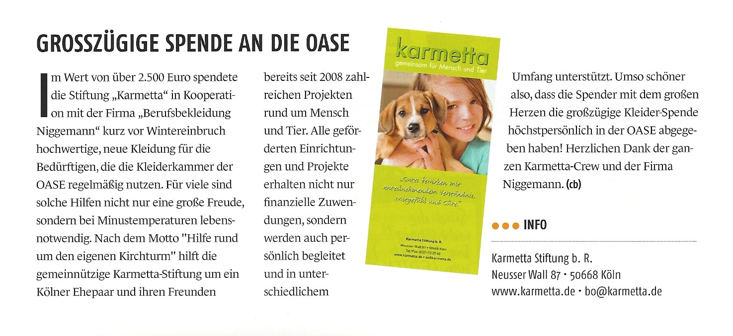 Der Umgang mit Tieren tut Menschen erwiesenermaßen gut. Oft ist das eigene Haustier sogar der wichtigste Sozialpartner. Umso schlimmer, wenn das Geld nicht mehr ausreicht, um für den eigenen Hund oder die Katze zu sorgen. Was tun, wenn man vor der schweren Entscheidung steht, sein Haustier aus Geldnot abgeben zu müssen? Die Tiertafel RheinErft e. V. hilft Menschen in finanzieller Not, Ihre Haustiere zu versorgen. Dieses engagierte Eintreten des Vereins für Mensch und Tier wurde mit der Verleihung des diesjährigen Karmetta-Förderpreises honoriert. „Die Preisverleihung soll zugleich Würdigung für das Geleistete und Ermutigung für die Zukunft sein“, so Bernd Oppermann, Vorstandsvorsitzender der Karmetta-Stiftung.
