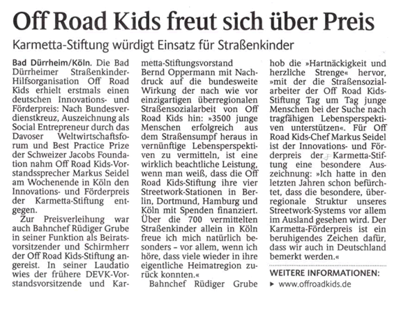 Mit der diesjährigen Verleihung des Karmetta-Förderpreises wurde die erfolgreiche Streetworker Arbeit von Off Road Kids erstmals auch in Deutschland gewürdigt. Im Ausland war die 1993 gegründete Hilfsorganisation für Straßenkinder bereits mehrfach ausgezeichnet worden. Markus Seidel, Vorstandssprecher der Off Road Kids Stiftung, nahm die Auszeichnung in Köln entgegen und wies auf deren besondere Bedeutung hin: „Der Karmetta-Förderpreis ist ein beruhigendes Zeichen, dass wir auch in Deutschland bemerkt werden“.