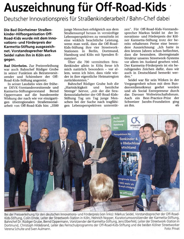 In seiner Laudatio unterstrich Bernd Oppermann, Vorstandsvorsitzender der Karmetta-Stiftung, die besondere Leistung von Off Road Kids: „3.500 junge Menschen erfolgreich aus dem Straßensumpf heraus in vernünftige Lebensperspektiven zu vermitteln ist eine wirklich beachtliche Leistung, wenn man weiß, dass die Off Road Kids Stiftung ihre vier Streetwork-Stationen in Berlin, Dortmund, Hamburg und Köln mit Spenden finanziert“. Über die 700 alleine in Köln vermittelten Straßenkinder freute sich Oppermann besonders. Der Höhepunkt der Veranstaltung war der Redebeitrag von Herrn Dr. Rüdiger Grube, Chef der Deutschen Bahn und Schirmherr der Off Road Kids Stiftung.